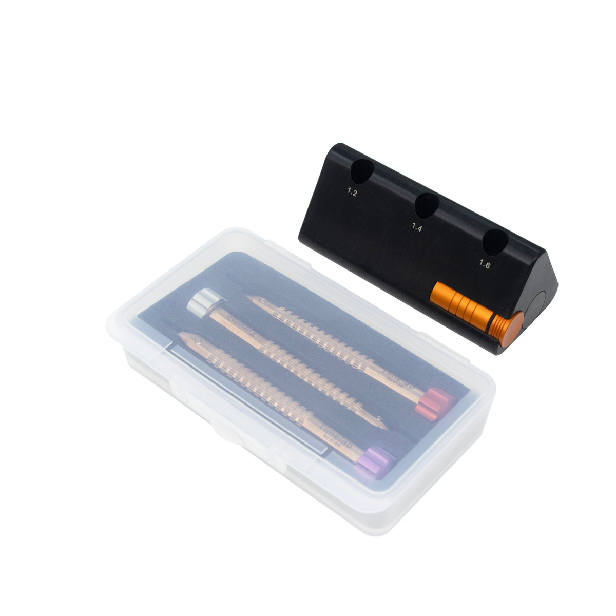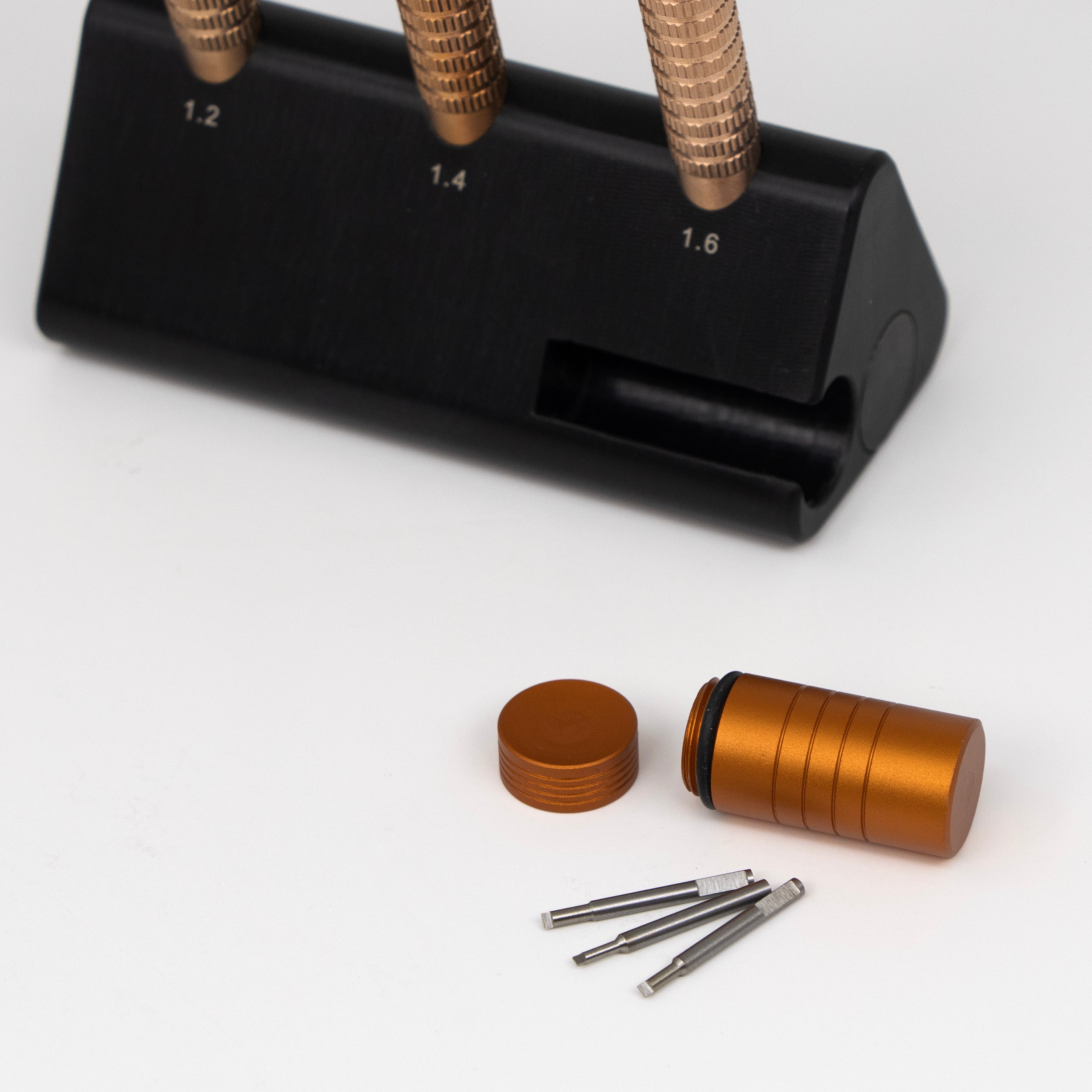 This screwdriver stand includes 3 holes for 1.20, 1.40, and 1.60mm screwdrivers. The body is made of solid acetal plastic, and the bottom doesn't skid.